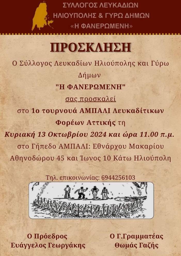 O Σύλλογος Λευκαδίων Ηλιούπολης και Γύρω Δήμων <<Η ΦΑΝΕΡΩΜΕΝΗ>> σας προσκαλεί στο 1o τουρνουά ΑΜΠΑΛΙ Λευκαδίτικων Φορέων Αττικής τη Κυριακή 13 Οκτωβρίου 2024 και ώρα 11.00 π.μ. στο Γήπεδο ΑΜΠΑΛΙ: Εθνάρχου Μακαρίου Αθηνοδώρου 45 και Ίωνος 10 Κάτω Ηλιούπολη.