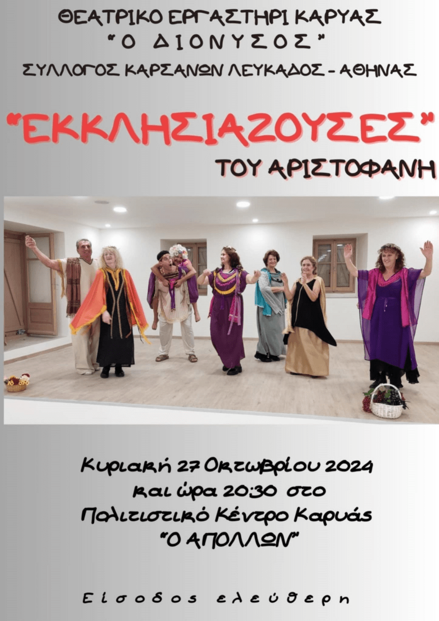 Πρώτο θεατρικό έργο που ανεβαίνει στη σκηνή είναι οι » ΕΚΚΛΗΣΙΑΖΟΥΣΕΣ ‘ του Αριστοφάνη.