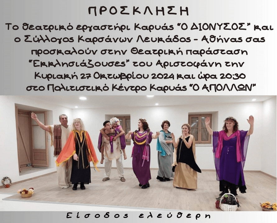 Το θεατρικό εργαστήρι Καρυάς ο «ΔΙΟΝΥΣΟΣ » ιδρύθηκε από τον Σύλλογο Καρσάνων Λευκάδος-Αθήνας με σκοπό την προσέγγιση και διδασκαλία της θεατρικής τέχνης και το ανέβασμα θεατρικών παραστάσεων.