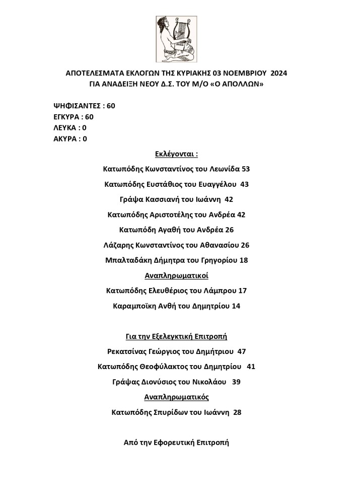 Ολοκληρώθηκαν οι εκλογές για την ανάδειξη του νέου Διοικητικού Συμβουλίου του Μ/Ο «Ο Απόλλων» την Κυριακή, 3 Νοεμβρίου 2024. Από τους 60 ψηφοφόρους, όλες οι ψήφοι ήταν έγκυρες, ενώ δεν υπήρξαν λευκά ή άκυρα ψηφοδέλτια.