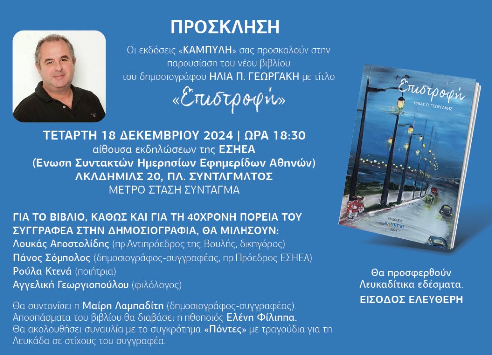 2. Οι εκδόσεις ‘ΚΑΜΠΥΛΗ’ σας προσκαλούν στην παρουσίαση του νέου βιβλίου του δημοσιογράφου ΗΛΙΑ Π. ΓΕΩΡΓΑΚΗ με τίτλο ‘ΕΠΙΣΤΡΟΦΗ’’ την Τετάρτη 18/12/2024 στις 6.30μμ στην αίθουσα εκδηλώσεων της ΕΣΗΕΑ (Ένωση Συντακτών Ημερησίων Εφημερίδων Αθηνών) -Ακαδημίας 20 – Πλ.Συντάγματος. Δείτε περισσότερες πληροφορίες στην επισυναπτόμενη πρόσκληση.