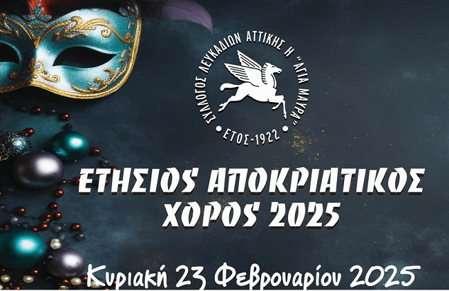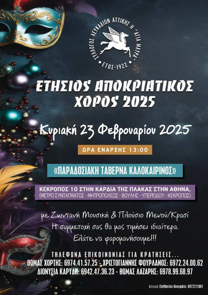 Σας προσκαλούμε στον αποκριάτικο χορό μας την Κυριακή των Απόκρεω 23/2/2025 το μεσημέρι. Απόκριες στην Αθήνα σημαίνει πλάκα. Και εμείς λοιπόν οι Λευκαδίτες της Αττικής θα φαρομανίσουμε στην καρδιά της πλάκας στην παραδοσιακή ταβέρνα «Καλοκαιρινός».