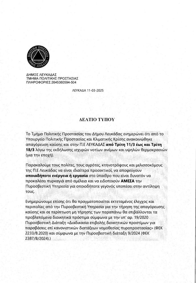 ΕΝΗΜΕΡΩΣΗ ΓΙΑ ΑΠΑΓΟΡΕΥΣΗ ΚΑΥΣΗΣ ΛΟΓΩ ΤΩΝ ΚΑΙΡΙΚΩΝ ΣΥΝΘΗΚΩΝ Απαγόρευση καύσης στην Περιφερειακή Ενότητα Λευκάδας από την Τρίτη 11 Μαρτίου έως και την Τρίτη 18 Μαρτίου. ΔΕΛΤΙΟ ΤΥΠΟΥ – Απαγόρευση καύσης 11-3-2025Λήψη Κοινοποιήστε: Μοιραστείτε στο X(Ανοίγει σε νέο παράθυρο) Χ Mοιραστείτε στο Facebook(Ανοίγει σε νέο παράθυρο) Facebook Εκτύπωση(Ανοίγει σε νέο παράθυρο) Εκτύπωση Στείλε ένα σύνδεσμο σε έναν φίλο(Ανοίγει σε νέο παράθυρο) Email Μου αρέσει! Φόρτωση... Δημοσιεύθηκε από i.vl Δείτε όλα τα άρθρα του/της i.vl