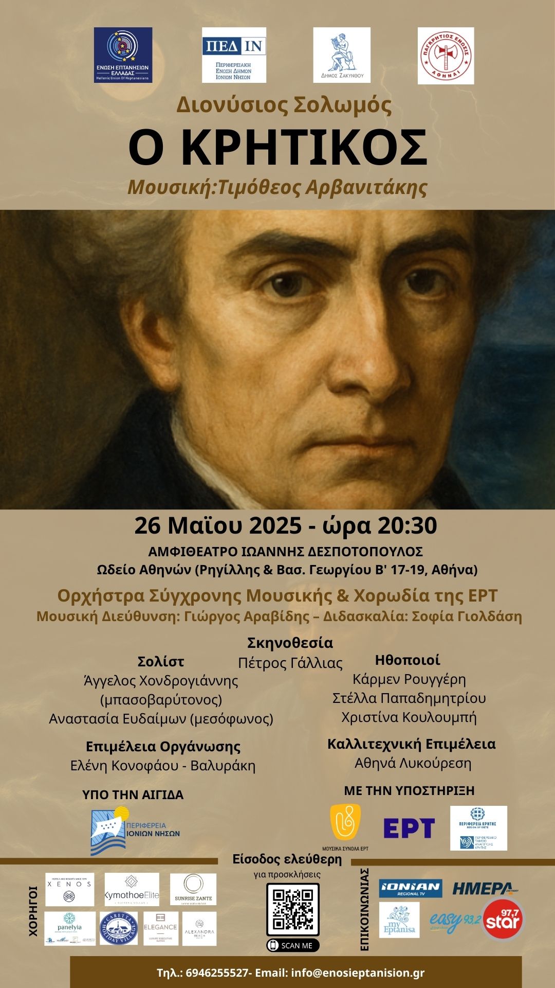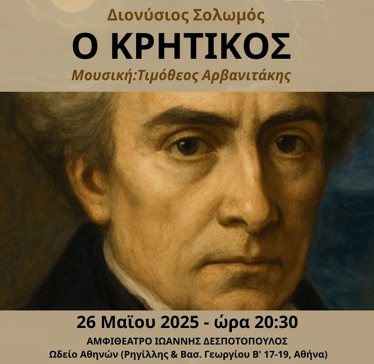 Σας προσκαλούμε να τιμήσετε με την παρουσία σας την εκδήλωση «Ο Κρητικός» του Διονύσιου Σολωμού, Μουσική: Τιμόθεος Αρβανιτάκης που θα πραγματοποιηθεί την Δευτέρα 26 Μαΐου 2025, ώρα 20:30 στο Αμφιθέατρο «Ιωάννης Δεσποτόπουλος» του Ωδείου Αθηνών (Ρηγίλλης & Βασ. Γεωργίου Β΄ 17‑19, Αθήνα).