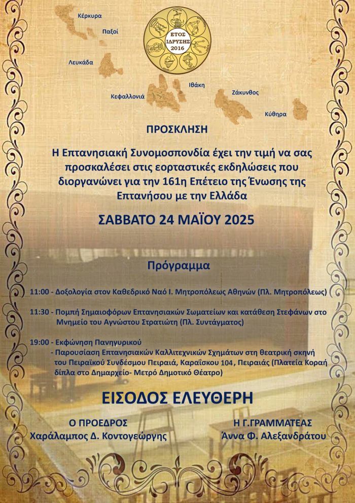 Καλούνται όλοι οι Επτανήσιοι, να τιμήσουν με την παρουσία τους, τις εορταστικές εκδηλώσεις που έχει προγραμματίσει η ΕΠΤΑΝΗΣΙΑΚΗ ΣΥΝΟΜΟΣΠΟΝΔΙΑ, με αφορμή την 161η επέτειο για την Ένωση των Επτανήσων με την Ελλάδα.