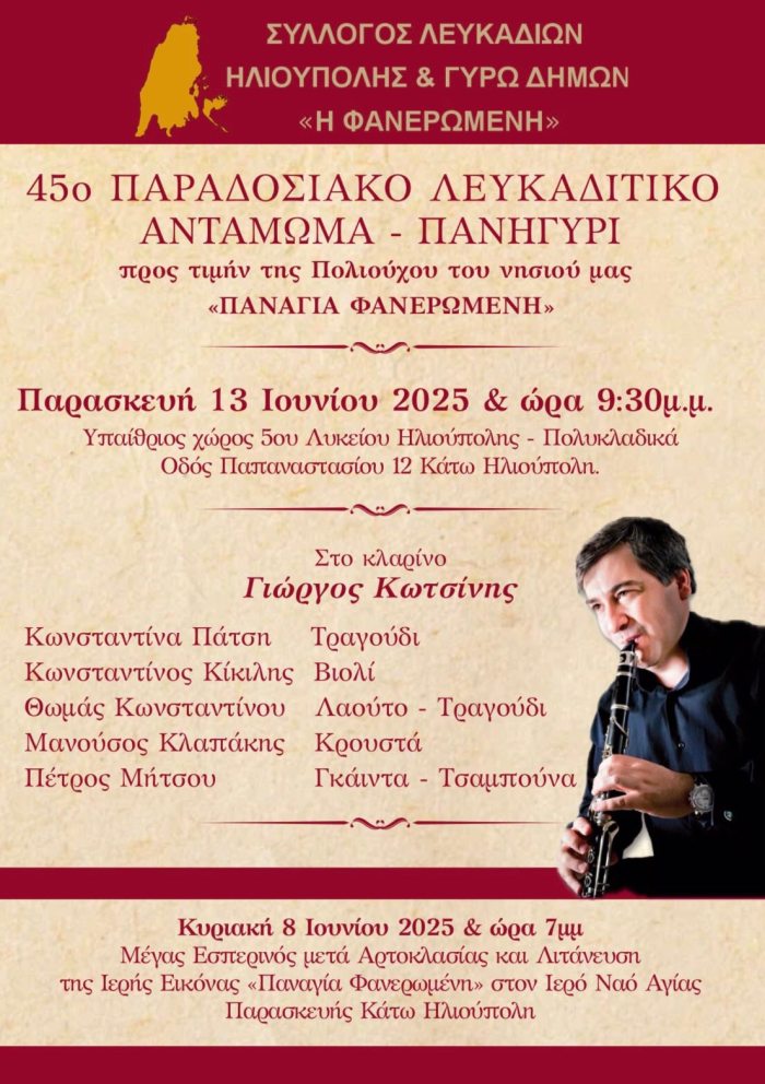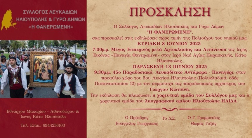 Ο Σύλλογος Λευκαδίων Ηλιούπολης & Γύρω Δήμων ” Η Φανερωμένη”, σας προσκαλεί στις εκδηλώσεις προς τιμήν της Πολιούχου του νησιού μας.