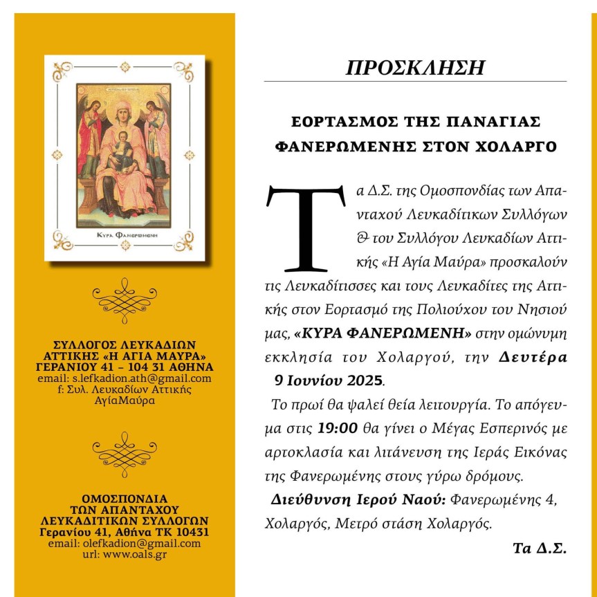 Την Δευτέρα 9/6/2025 εορτάζει η Πολιούχος του η Προστάτιδα του νησιού μας «Κυρά Φανερωμένη». Οι Λευκαδίτες/σες της Αττικής, όπως κάθε χρόνο, θα τιμήσουν τον εορτασμό της στην ομώνυμη εκκλησία του Χολαργού.