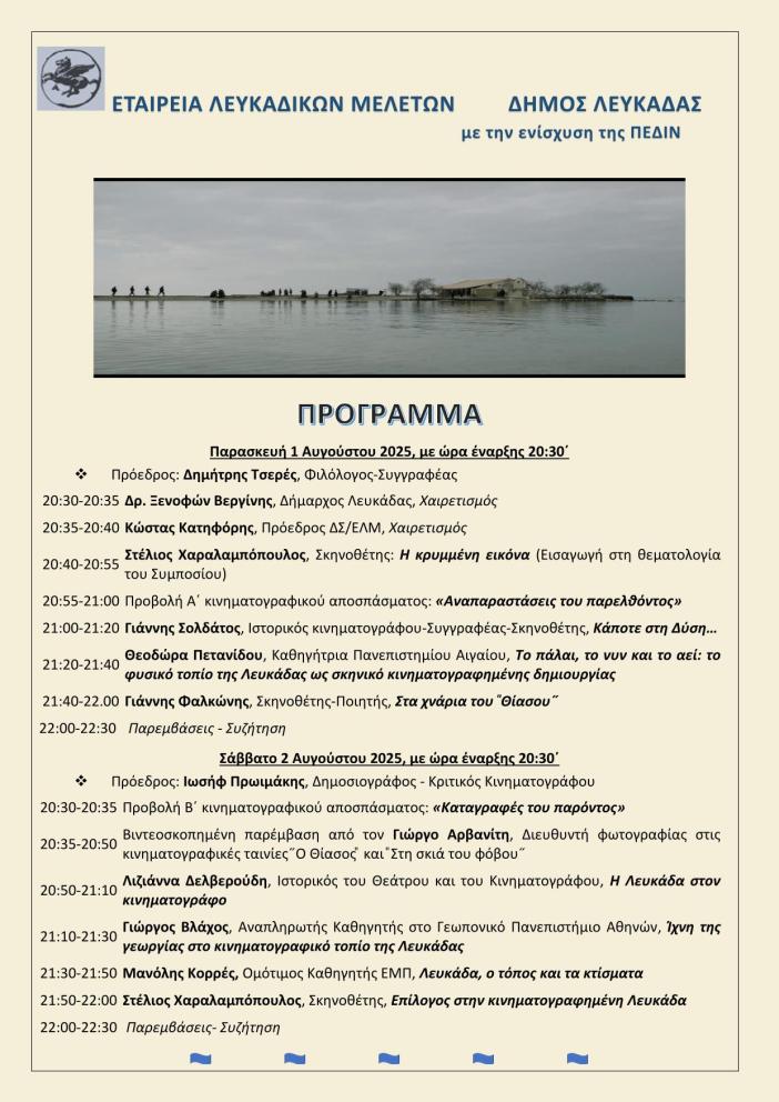 | 21:20-21:40 | Θεοδώρα Πετανίδου,Καθηγήτρια Πανεπιστημίου Αιγαίου,Το πάλαι, το νυν και το αεί: το φυσικό τοπίο της Λευκάδας ως σκηνικό κινηματογραφημένης δημιουργίας | |