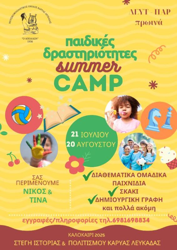 Ο Μουσικοφιλολογικός Όμιλος Καρυάς Λευκάδας “Ο Απόλλων” διοργανώνει πρωινό summer camp γεμάτο χαρά, δημιουργικότητα και παιχνίδι!