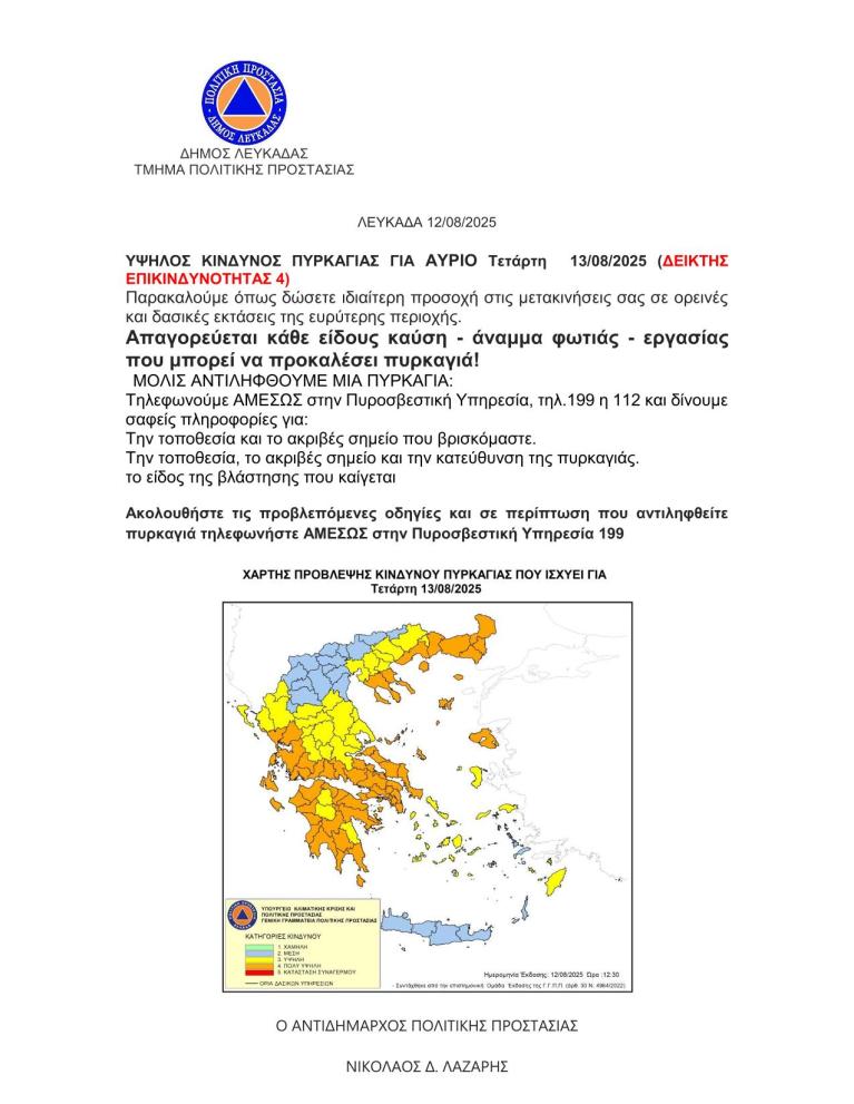 - Ενημερώνουμε τους συνδημότες και τις συνδημότισσές μας, σύμφωνα με τον χάρτη πρόβλεψης κινδύνου πυρκαγιάς που εκδόθηκε χθές προβλέπεται για σήμερα 12/08/2025 ΠΟΛΥ ΥΨΗΛΟΣ ΚΙΝΔΥΝΟΣ ΠΥΡΚΑΓΙΑΣ (κατηγορίας 4). Κατόπιν των προαναφερομένων καλούνται οι δημότες να προβούν στις εξής ενέργειες :