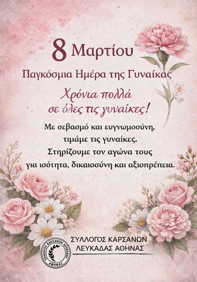 Ο Σύλλογος Καρσάνων Λευκάδας Αθήνας τιμά τις γυναίκες που αγωνίστηκαν και συνεχίζουν να αγωνίζονται για ισότητα, αξιοπρέπεια και δικαιοσύνη.