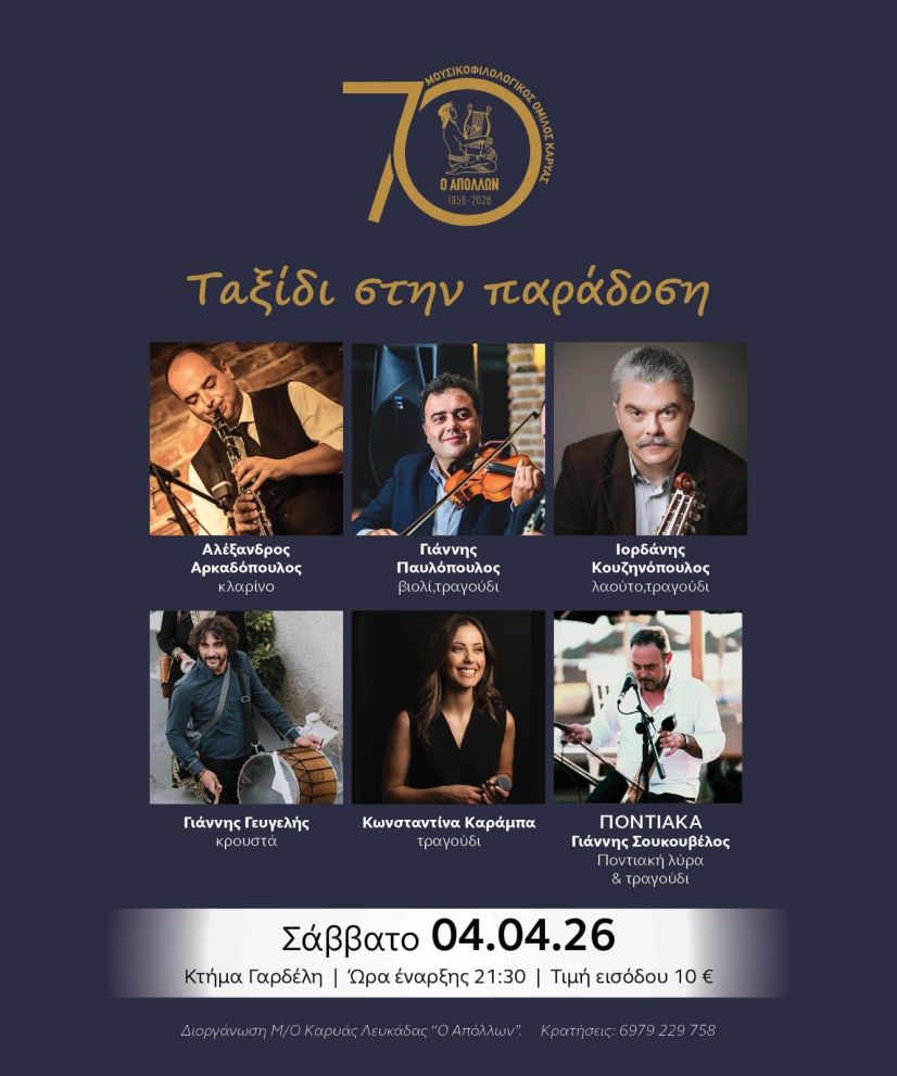 Το Διοικητικό συμβούλιο του Μ/Ο «Ο Απόλλων» Καρυάς σας προσκαλεί το Σάββατο 4 Απριλίου και ώρα 21:30 στο κτήμα Γαρδέλη σε ένα μουσικο-χορευτικό ταξίδι την παράδοση μας..